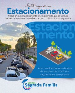 A Escola Sagrada Família, nas unidades Cidade Jardim e Parque Amazônia, conta com estacionamento interno amplo, pensado para garantir conforto, organização e total segurança no embarque e desembarque dos alunos.